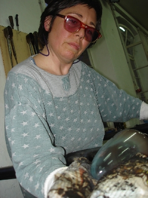 Hier formt die Künstlerin das heiße Glas mit einer mehrlagig gefalteten nassen Zeitung.